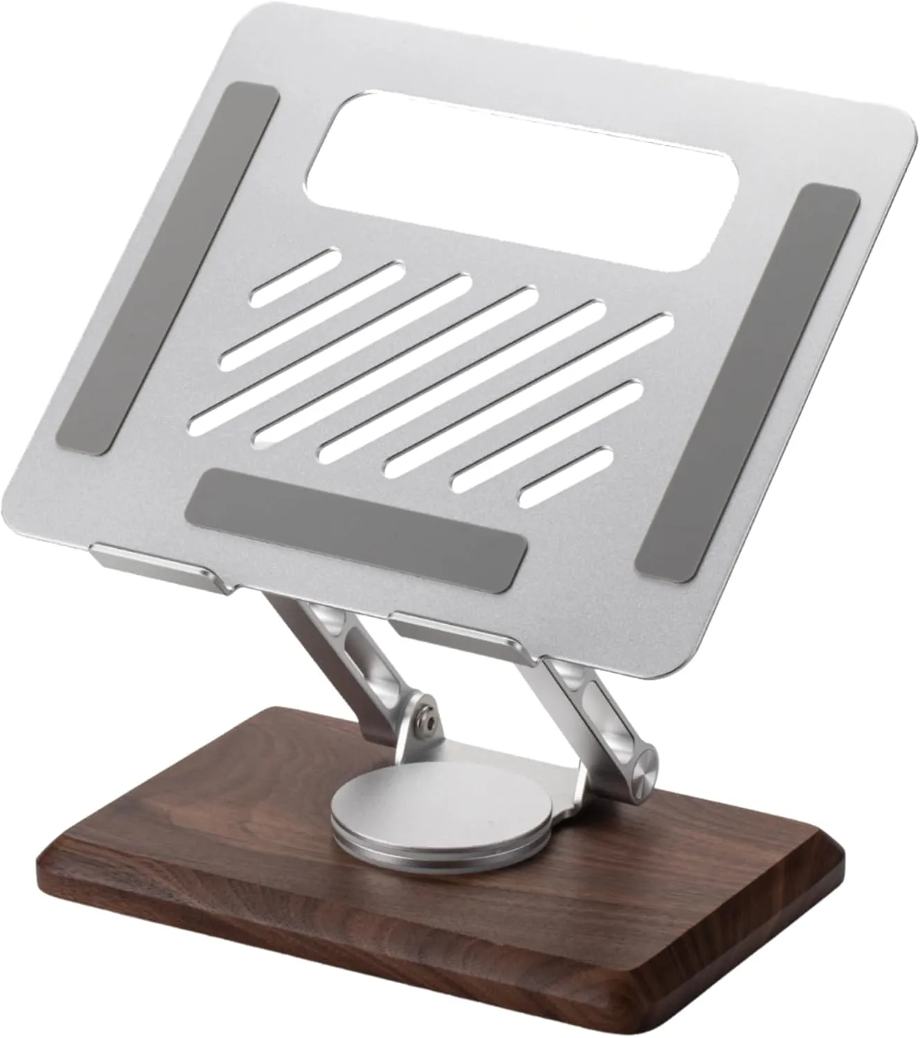 Enhance your workspace with this ergonomic wooden laptop stand featuring a 360° rotating walnut base and adjustable height for better posture. Designed for 10–17.3 inch laptops, it offers a stable, ventilated, and stylish setup for desks at home or office.